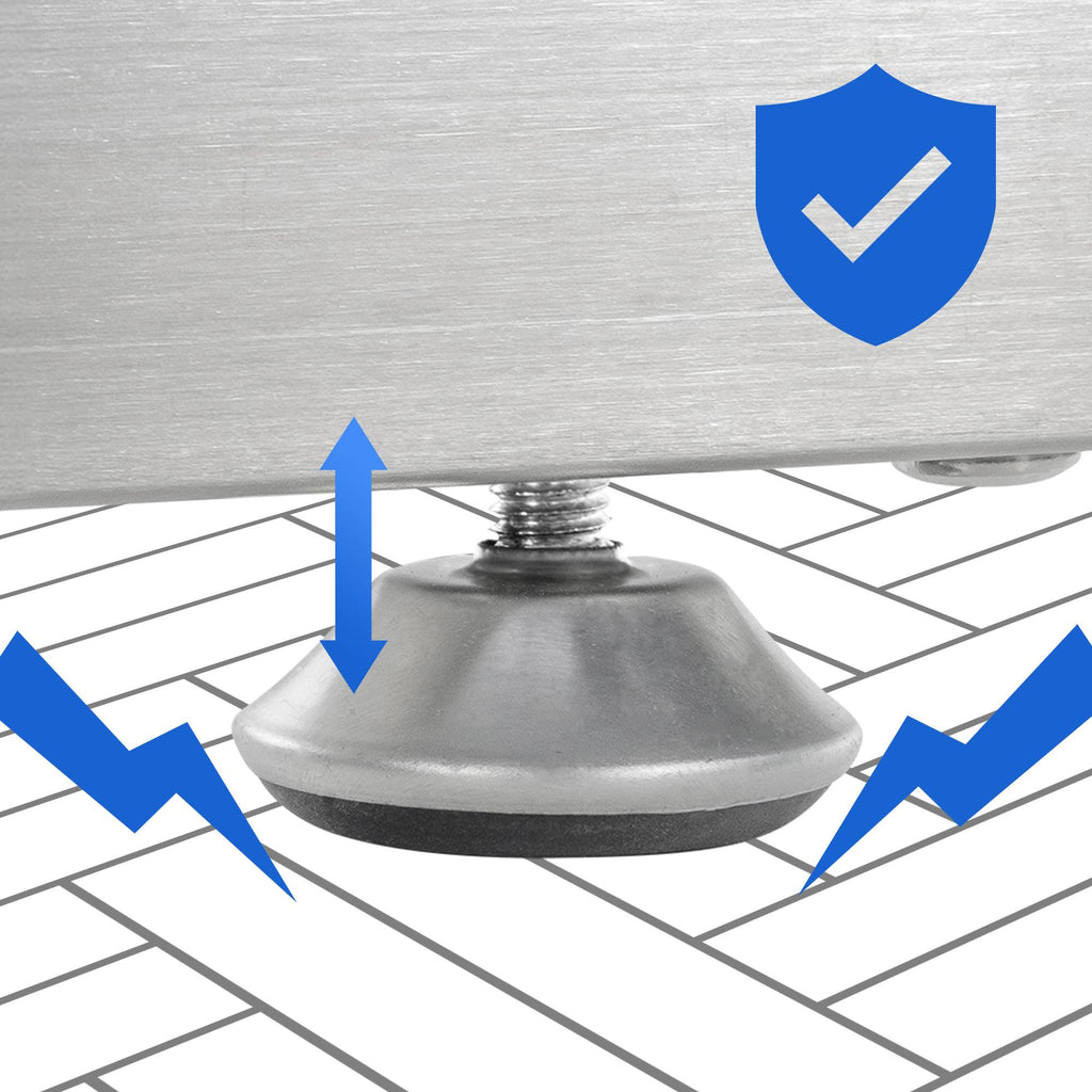Para evitar que la leña se caiga, hay 3 travesaños a cada lado. También garantizan una estabilidad adicional de la estantería para leña. Además, la estantería está equipada con 4 protectores de suelo regulables en altura para compensar desniveles.
