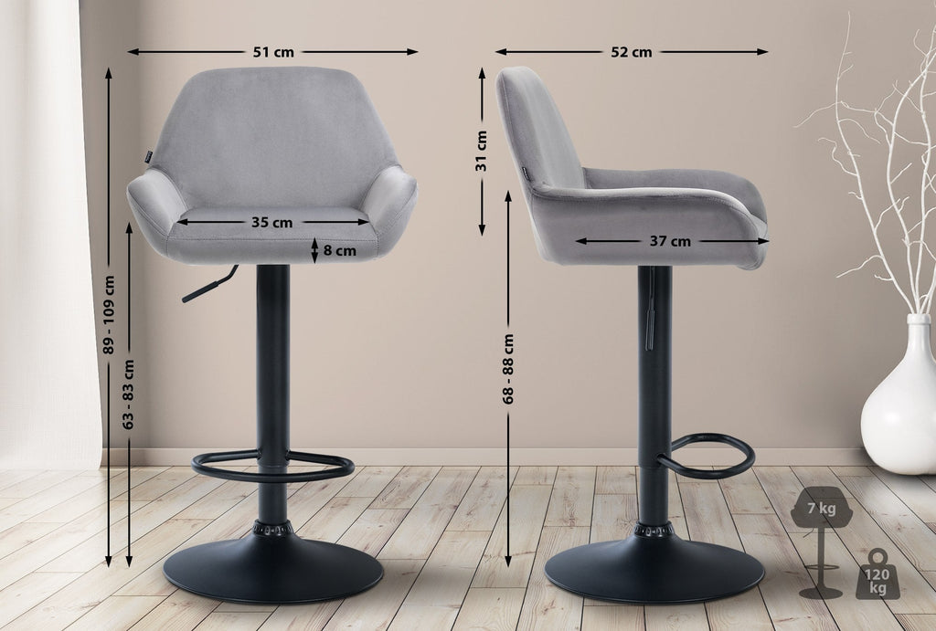 Estos modernos taburetes de cocina se caracterizan por su diseño atemporal y elegante. Los asientos con reposabrazos prometen una experiencia fantástica al sentarse, ya que el respaldo acolchado proporciona a la espalda el apoyo necesario para sentarse cómodamente durante horas. Las sillas altas de cocina están tapizadas en terciopelo y la base es de metal, aportando a las sillas giratorias gran estabilidad. La base tiene integrado un reposapiés curvado que ayuda a mantener una postura más erguida y cómoda. El juego de 2 taburetes de mostrador se puede ajustar en altura de forma continua mediante un elevador de gas y el asiento puede girar 360°, por lo que es ideal para cualquier mostrador o barra.